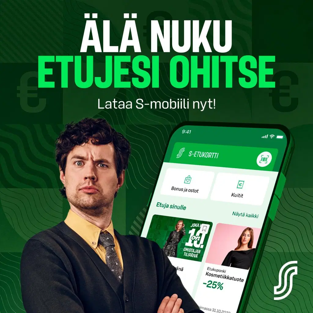S-mobiili on asiakasomistajille räätälöity sovellus, joka S-Etukortin, S-Pankin palvelut sekä ajankohtaiset edut yhteen kätevään sovellukseen. Tarjoamme viikoittain vaihtuvia, rahanarvoisia, kuponkeja S-mobiili-sovelluksen kautta.