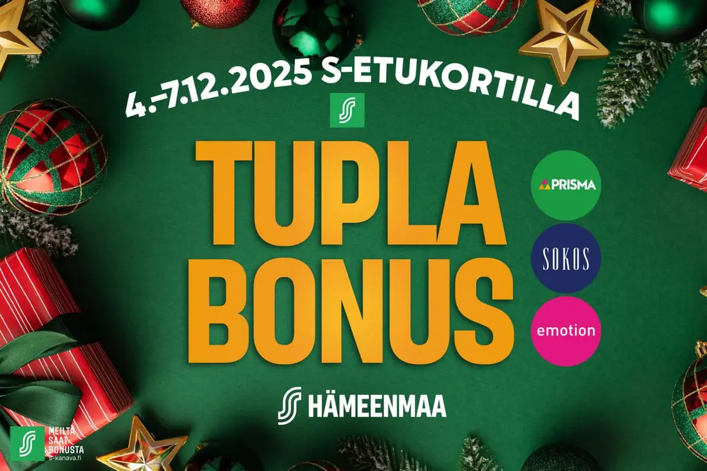 Nyt kannattaa tehdä joulun isot hankinnat ja kerryttää kunnon Bonus! TuplaBonusta saat 4.–7.12.2025 S‑Etukortilla Hämeenmaan Prismoista, Emotioneista ja Lahden Sokoksesta!TuplaBonus ‑kampanjaostojen bonusprosentti määräytyy koko kuukauden bonusostojesi mukaan. Jos kaikki kuukausiostosi oikeuttavat 5 %:n Bonukseen, saat kampanja‑aikana kampanjaan kuuluvista toimipaikoista tehdyistä ostoista 10 % Bonusta.Kampanja ei koske prisma.fi eikä sokos.fi verkkokaupan ostoja.