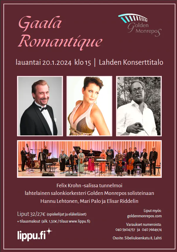 20.1.2024 lauantaina klo 15.00 on upea Gaala-konsertti Lahden Konserttitalolla Felix Krohn-salissa. Golden Monrepos salonkiorkesterin solistina huikeat artistit: Mari Palo, Hannu Lehtonen ja viulisti-kapellimestari Elisar Riddelin. Liput S-Etukortilla 25 € (norm. 32 €). Osta liput täältä!