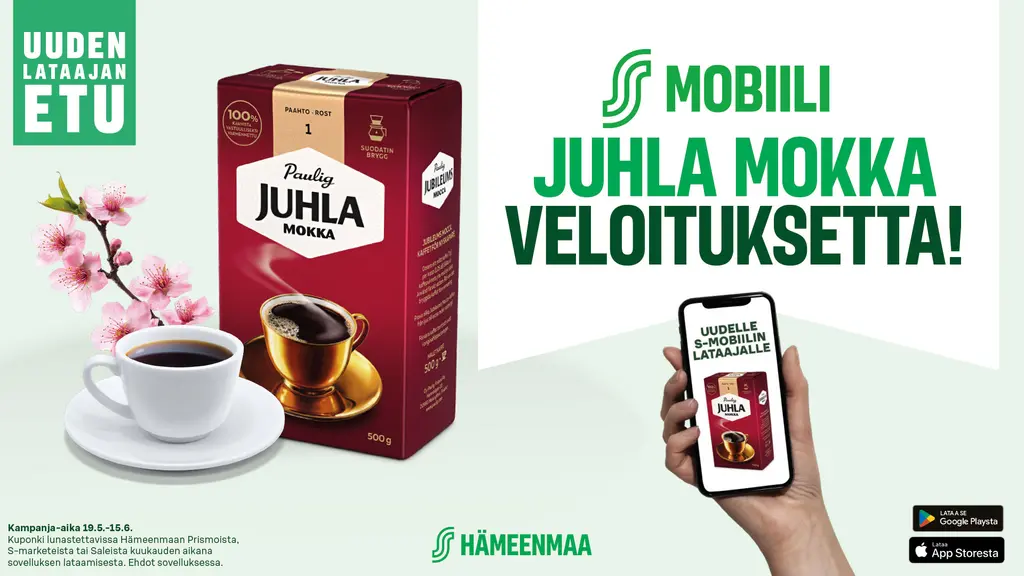 S-mobiili on maksuton S-ryhmän kaupan ja S-Pankin palvelut yhdistävä mobiilisovellus. Saat kaikki S-mobiilin palvelut käyttöösi S-Pankin verkkopankkitunnuksilla tai toisen pankin verkkopankkitunnuksilla tai mobiilivarmenteella, kun sinulla on tili ja verkkopankkitunnukset S-Pankissa.Uuden lataajan etu Juhla Mokka kahvipaketti 400-500g veloituksetta koskee ensimmäistä kertaa S-mobiilin käyttöönottavia Osuuskauppa Hämeenmaan asiakasomistajia sekä heidän asiakasomistajatalouteensa kuuluvia henkilöitä. Etukuponki ilmestyy S-mobiiliin n. kahden päivän kuluttua sovelluksen käyttöönotosta. Kampanja-aika 19.5.-15.6.2025. Kuponki lunastettavissa Hämeenmaan Prismoista, S-marketeista tai Saleista kuukauden aikana sovelluksen lataamisesta.NÄIN OTAT S-MOBIILIN KÄYTTÖÖSI >>