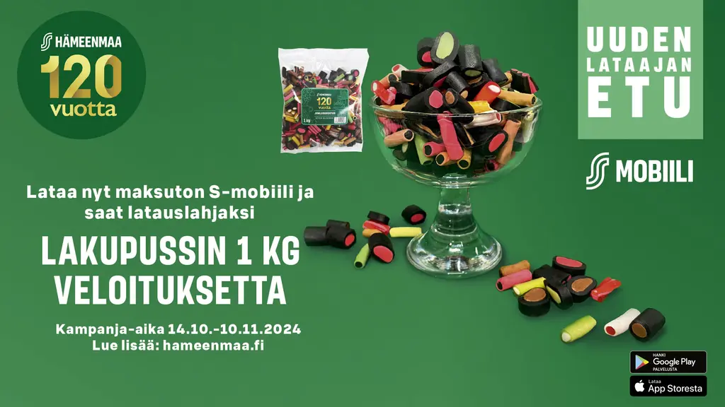 S-mobiili on maksuton S-ryhmän kaupan ja S-Pankin palvelut yhdistävä mobiilisovellus. Saat kaikki S-mobiilin palvelut käyttöösi S-Pankin verkkopankkitunnuksilla tai toisen pankin verkkopankkitunnuksilla tai mobiilivarmenteella, kun sinulla on tili ja verkkopankkitunnukset S-Pankissa.Nyt kaikki uudet sovelluksen lataajat, jotka ovat Osuuskauppa Hämeenmaan asiakasomistajia, saavat noin 2 päivän kuluttua kupongin S-mobiili-sovellukseen, jolla saat ilmaisen Hämeenmaa 120-v. lakupussin 1 kg.Kampanja-aika 14.10.-10.11.2024. Kuponki lunastettavissa Hämeenmaan Prismoista, S-marketeista tai Saleista kuukauden aikana sovelluksen lataamisesta.NÄIN OTAT S-MOBIILIN KÄYTTÖÖSI >>