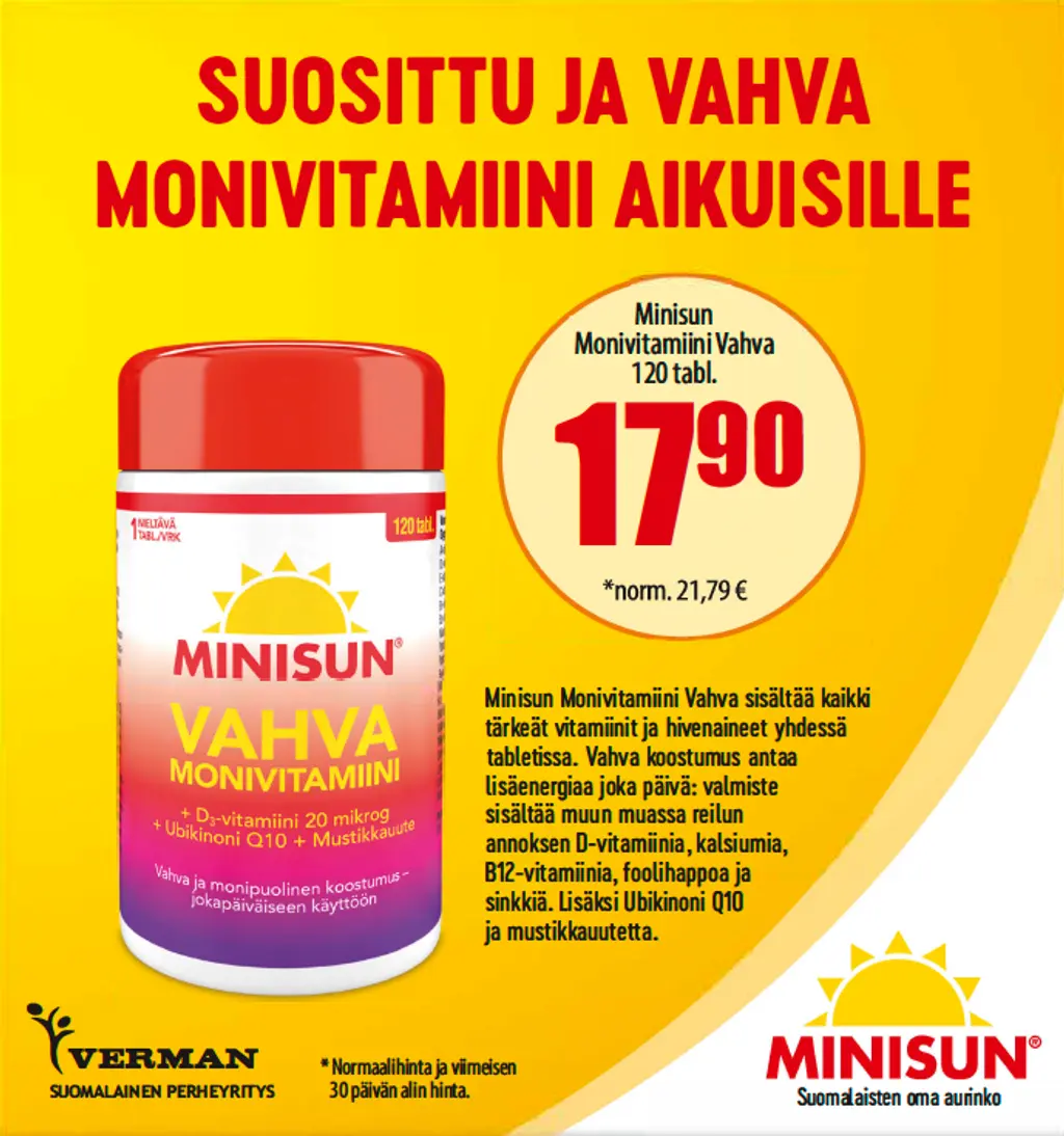 Voit kerryttää Bonusta S-Etukortilla myös apteekkien itsehoitotuotteista. Bonusta eivät kerrytä lääkevalmisteet (esim. resepti- ja itsehoitolääkkeet).Suosittu ja vahva monivitamiini aikuisille! Minisun monivitamiini vahva 120 tbl 17,90€ (norm. 21,79€). Minisun Monivitamiini Vahva sisältää kaikki tärkeät vitamiinit ja hivenaineet yhdessä tabletissa. Vahva koostumus antaa lisaenergiaa joka paiva: valmiste sisältää muun muassa reilun annoksen D-vitamiinia, kalsiumia, B12-vitamiinia, foolihappoa ja sinkkiä. Lisäksi Ubikinoni Q1D ja mustikkauutetta.Mukkulan apteekki – S-market Mukkula, Lahti