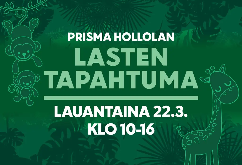 Prisma Hollolassa vietetään lastentapahtumaa lauantaina 22.3. klo 10-16!• Tuote-esittelijät: Mr. Panini, Fazer Puikula, Lejos / True Dates Taatelit, Grandiosa, Conaxesstrade, Valio Oddlygood, Parrano juusto• Ilmapallotaikuri tekee ilmapallohahmoja klo 10-16, esitykset klo 10.30 ja klo 13.• Kasvomaalausta klo 10-16• Sini- ja Sulo-nallet tavattavissa klo 10-16• Lapsille aarteenetsintää• Luvassa myös mahtavia tarjouksiaTervetuloa!
