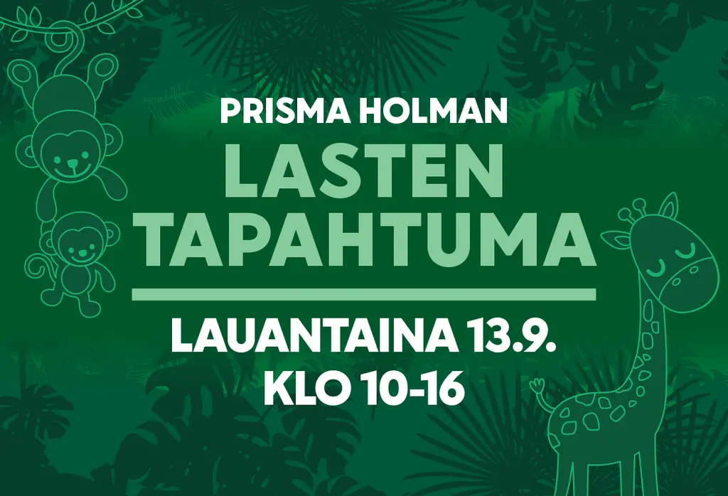 Prisma Holmassa vietetään lastentapahtumaa lauantaina 13.9. klo 10–16!• Tuote-esittelijät: Mr. Panini, Fazer Puikula, Grandiosa kiviuunipizzat, Kinnarin Tila, Conaxesstrade / Mr. Browniet, Lejos / True Dates Taatelit• Ilmapallotaikuri tekee ilmapallohahmoja klo 10–16, esitykset klo 10.30 ja klo 13.• Kasvomaalausta klo 10–16• Sini- ja Sulo-nallet tavattavissa klo 10–16• Fazerin pisteellä koristellaan lasten kanssa berliininmunkkeja klo 11-13• Lapsille aarteenetsintää• Luvassa myös mahtavia tarjouksiaPrisma Holman ravintolamaailma myös menossa mukana.Tervetuloa!
