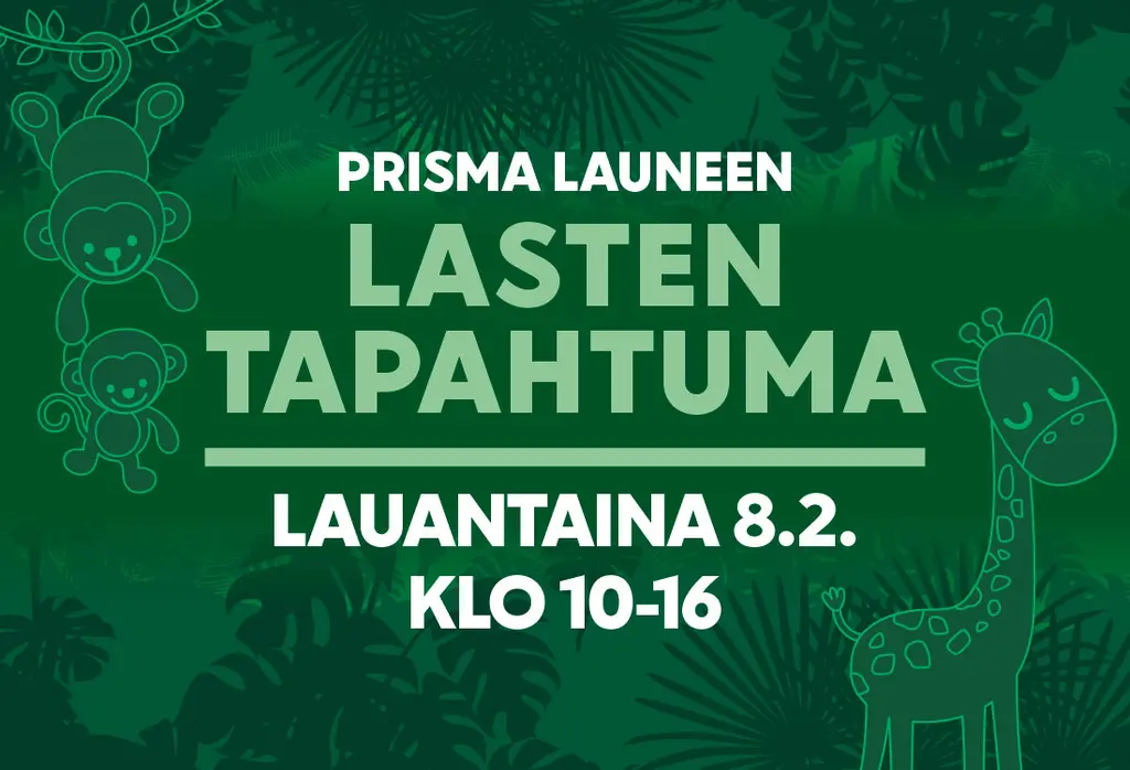 Prisma Launeella vietetään lastentapahtumaa lauantaina 8.2. klo 10-16!• Tuote-esittelijät: Mr. Panini, Pizza Backen, Kartanon Leipä ja Mr. Brownie• Ilmapallotaikuri tekee ilmapallohahmoja klo 10-16, esitykset klo 10.30 ja klo 13.• Kasvomaalausta klo 10-16• Sini- ja Sulo-nallet tavattavissa klo 10-16• Lapsille aarteenetsintää• Luvassa myös mahtavia tarjouksiaLA 8.2. Prisma Launeen Ravintolamaailmassa onnenpyörä klo 10.30-16 sekä ilmapalloja jaossa lapsille.Buffet-ruokailun yhteydessä LA 8.2. Jälkiruokasirkus 3,60€ (norm. 4,50€)Tervetuloa!