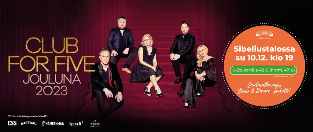 Club For Five tuo tänäkin vuonna joulun suomalaisten sydämiin. Yhtyeen viime jouluna loppuunmyyty JOULUNA -konsertti liikkuu sulavasti tunnelmasta toiseen luoden kuulijalleen vuoroin hartaita hengähdyksiä, vuoroin iloa ja kuplivaa joulun odotuksen riemua. Tule kokemaan joulun rakastetuin konsertti!Konsertin kesto n. 2 tuntia 15 minuuttia, sisältää väliajan.Liput S-Etukortilla 42€ (norm. 47€). Tästä lippukauppaan >>
