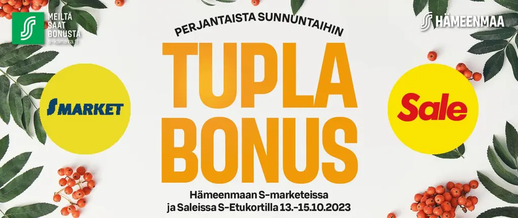 Nyt kannattaa tehdä syksyn herkkuostokset ja kerryttää kunnon Bonus! TuplaBonuksen saat S-Etukortilla 13.–15.10.2023 Hämeenmaan S-marketeista ja Saleista.
